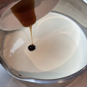 Heated 35% whipping cream with honey to make dark chocolate whipped ganache