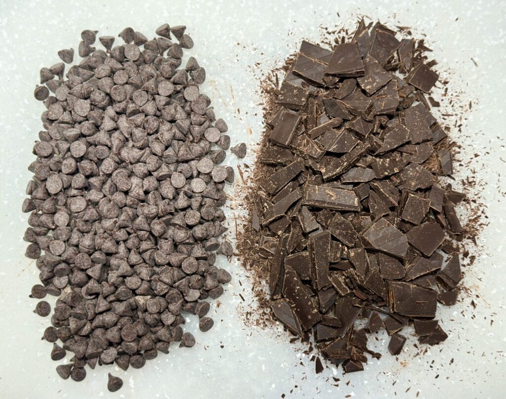GHIRARDELLI Semisweet Baking Chocolate Chips on the left and Lindt Excellence 70% cacao dark chocolate on the right.