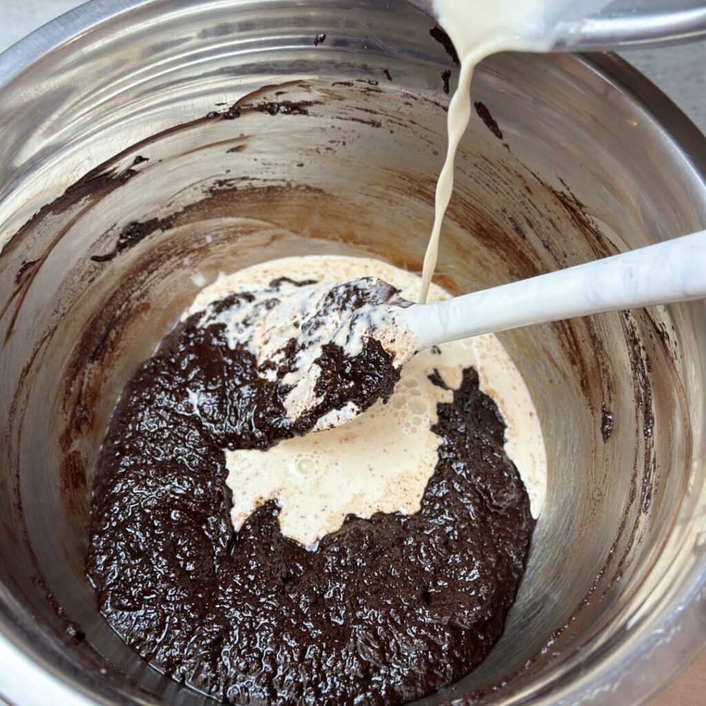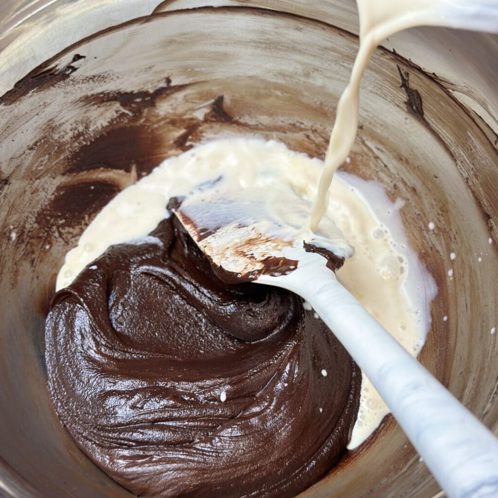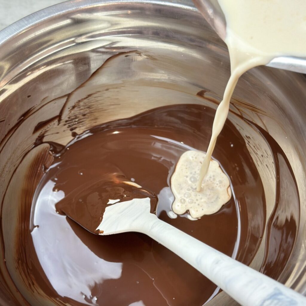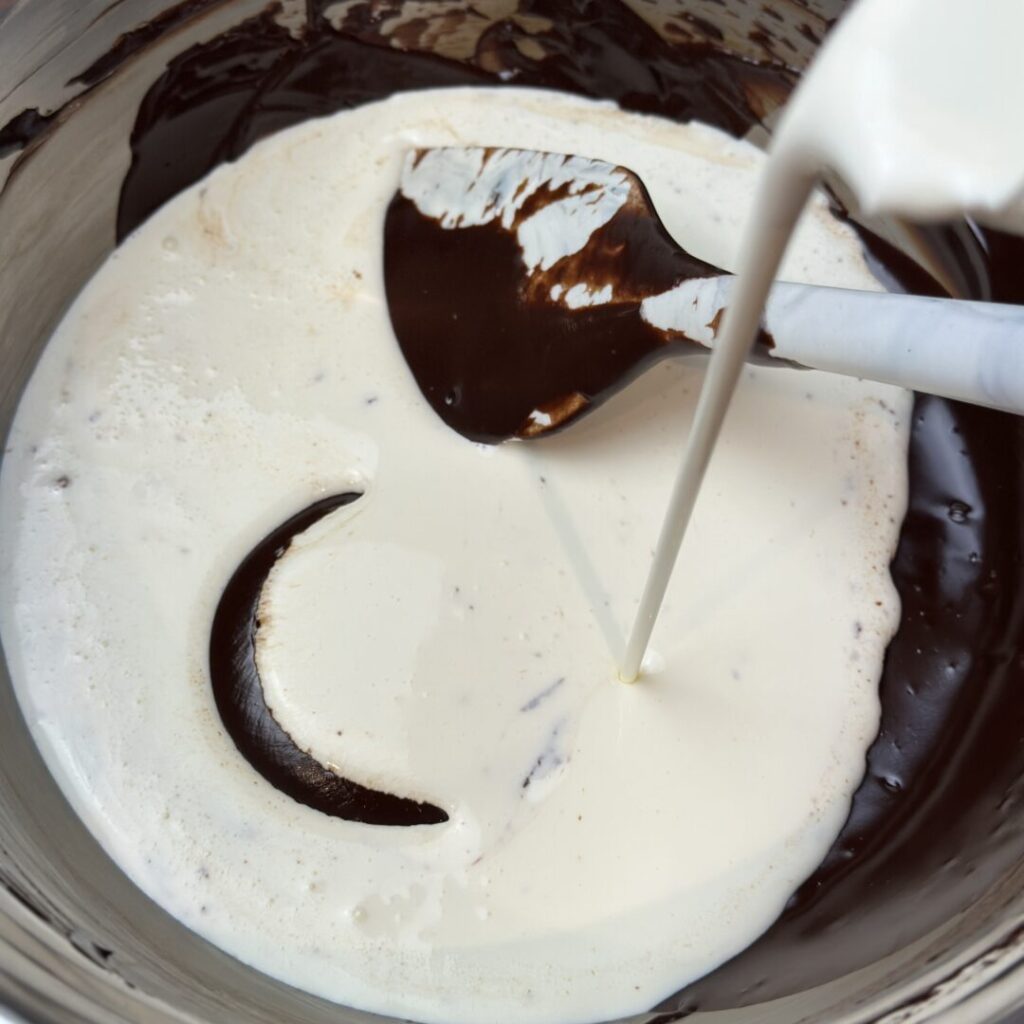 Cold whipping cream being added to a dark chocolate ganache to make it a dark chocolate whipped ganache