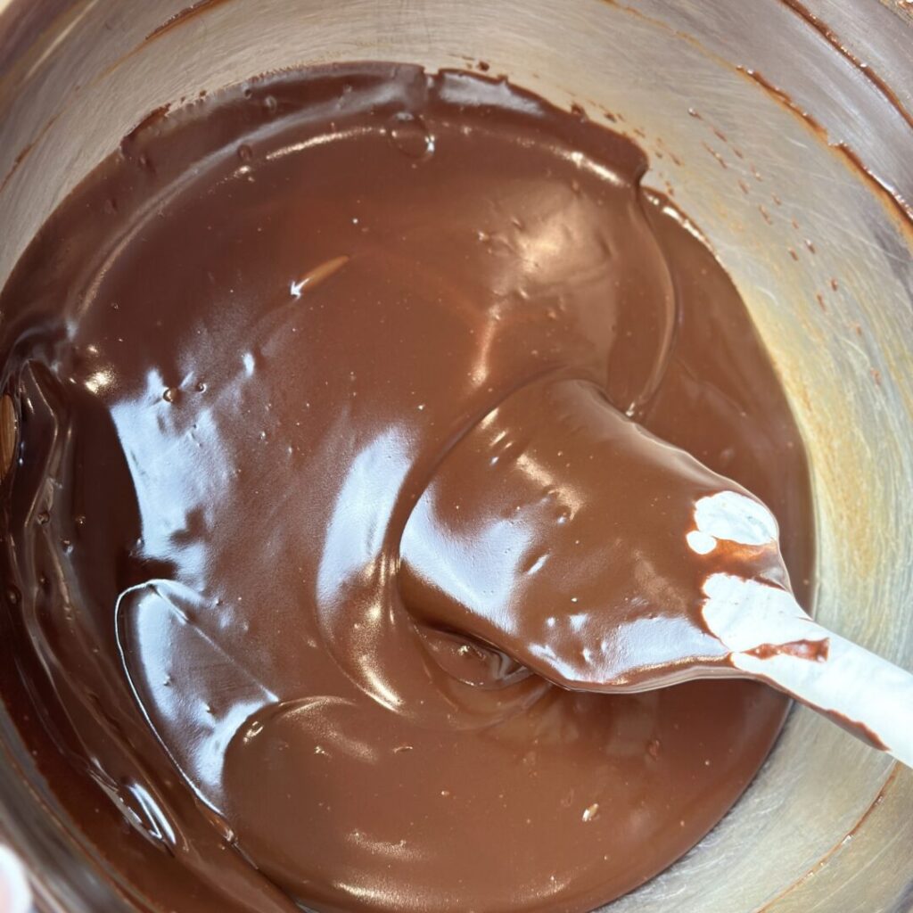 semi melted Lindt Excellence 70% cacao dark chocolate on a double-boiler to prepare sab pastries dark chocolate whipped ganache Fully melted and glossy Lindt Excellence 70% cacao dark chocolate on a double-boiler to prepare sab pastries dark chocolate whipped ganache
