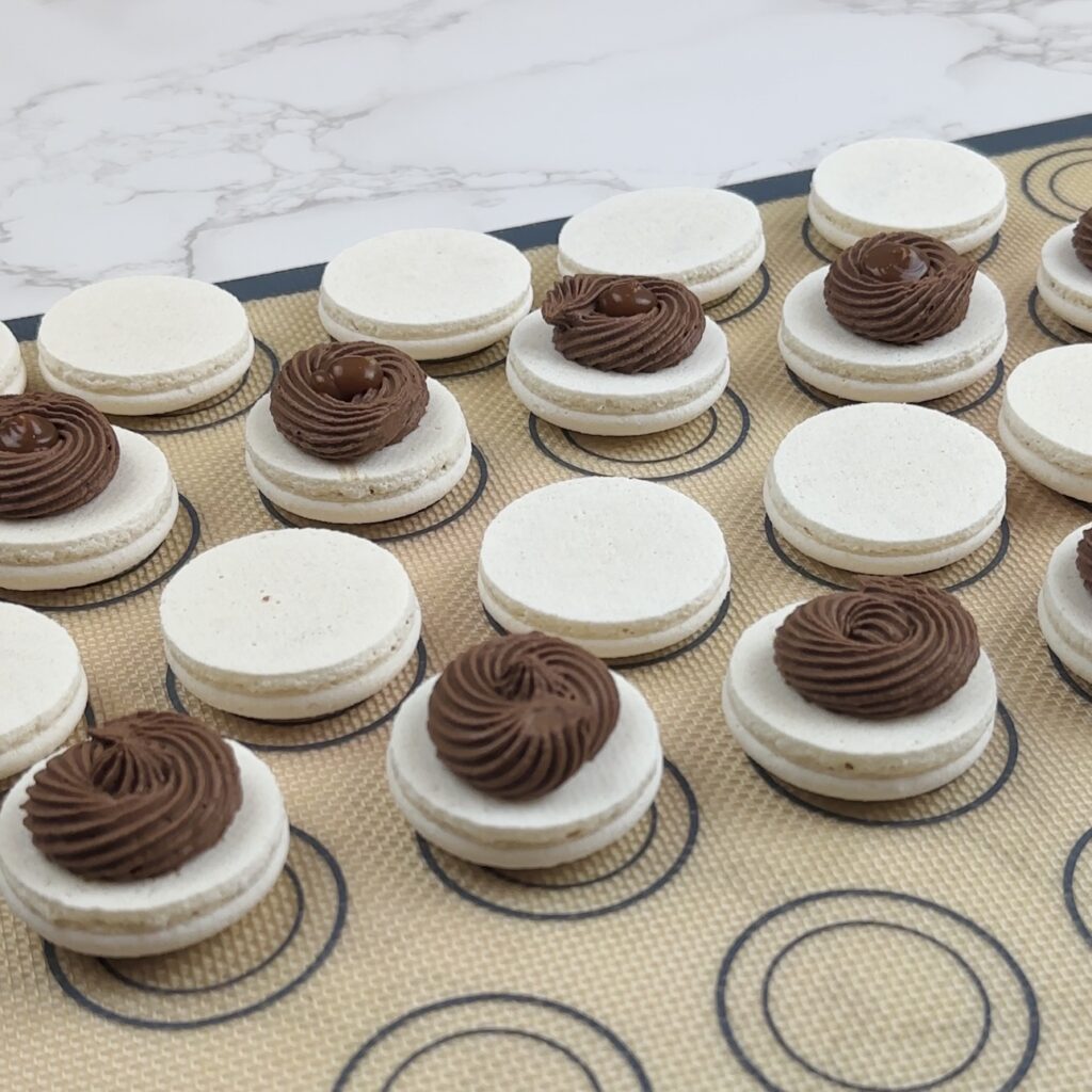 Dark Chocolate Whipped Ganache piped onto macaron shells