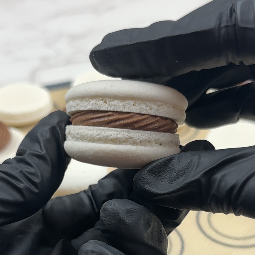 Dark Chocolate Whipped Ganache sandwiched in macaron shells